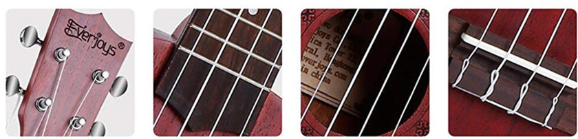 Leicht zu erlernen: Verbringen Sie mehr Zeit mit Spielen und weniger Zeit mit dem Stimmen! Genaue und glatte, verchromte Tuner im Gitarrenstil, damit Ihre Ukulele immer in Einklang bleibt. 12 Bünde aus Neusilber mit korrekten Bünden mit Markierungen am 5., 7., 10. Bund am Hals, oben auf dem Griffbrett